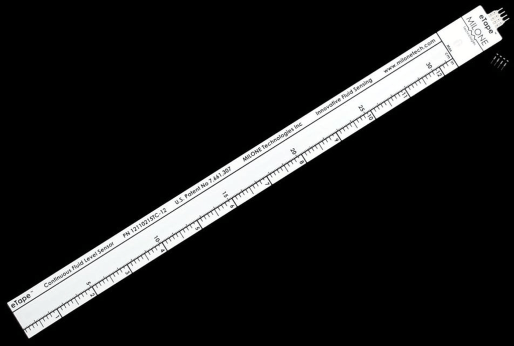 The eTape Liquid Level Sensor by Milone Technologies is a resistive fluid level sensor that changes its resistance based on the pressure exerted by a liquid. It is made of a flexible plastic strip and contains a conductive ink that reacts to compression caused by the rising liquid. The higher the liquid, the more pressure, and the lower the resistance.